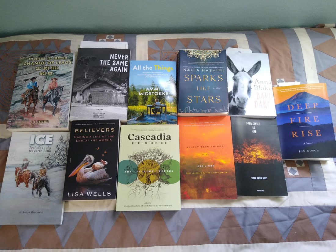 It’s been a fun month, but I bought too many books. Is there such a thing as too many books? Not really. I visited some friends on the west side of the State over the last month. I bought some books and was given some books. I bought some books from a woman selling at a festival, because I was curious how the selling was going, and if I might want to do something like that in the future. After querying her in great detail, I thought I should buy a book, then she gave me another. I hope her books are good; I haven’t cracked them yet. Most recently, I bought even more books at Spokane’s Get Lit festival, a celebration of writers and readers.