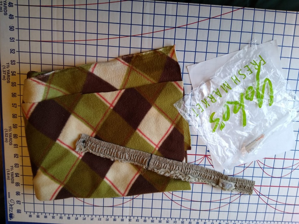 If you are using elastic instead of re-using a waistband, make the bottom side of your cover material about 1.5 inches longer. Sew top and side seams of cover first, then fold up a casing for your elastic, at least ¼ inch wider than the elastic. Sew along the edge of this folded hem, leaving about a 1-inch gap in the seam. Measure out the length of elastic to fit comfortably over your wrist. Use a large safety pin to thread the elastic through the casing. Sew elastic ends together. You can then sew together the one-inch gap in the seam, or if you are lazy like me, just leave it open. It won’t be obvious from the outside.