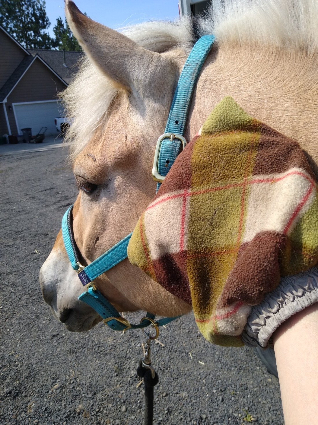 Nonetheless, despite the criticisms, the fly mitts are working fine. On my last mountain ride, I had 20 mosquito bites on my lower leg, and no obvious bites on my horse. I should have applied the spray to myself. Or maybe worn armor. Hmmm. I wonder what I can upcycle into mosquito armor?