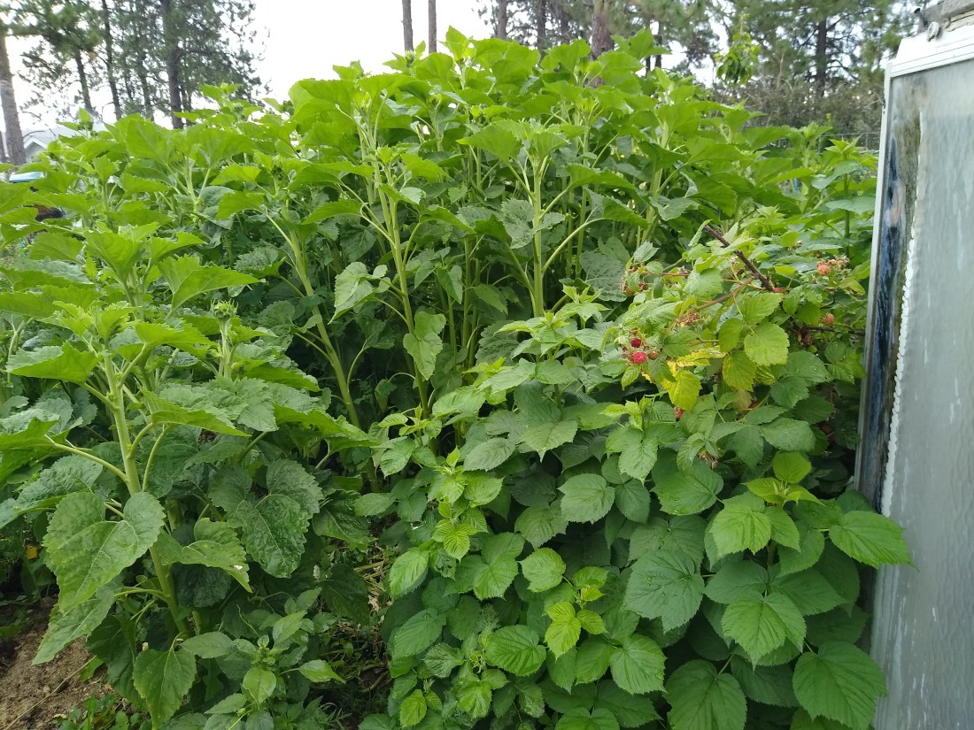 [I tried to get a good photo of the air conditioners, but they were just too darn ugly. Instead, I included a picture of the well-watered sunflowers and raspberries that are discussing how to take over Spokane, as a first step on their path to world domination.]