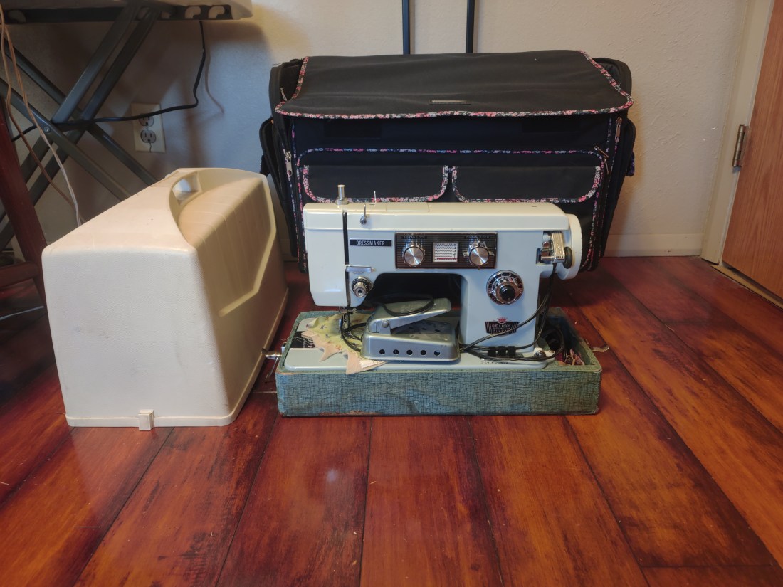I noticed all the skilled and serious sewers brought their own machines: sleek, stylish, modern, and lightweight machines. From those skilled seamstress people I learned that there are ready-made sewing machine cases on wheels, with expanding handles, and numerous pockets for accessories and threads. Like rolling luggage, but squatty. I watched as the menders easily pulled their gear behind them in their brightly colored roller bags, and easily lifted their machines to the tables. I wanted one of those bags.