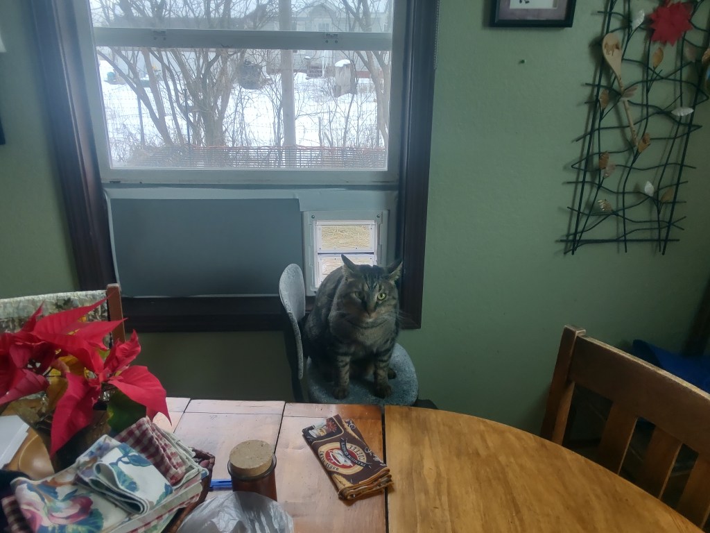 Finally, morning came. I got up, started coffee, and let the cats go outside. I needed a mental break. I looked around the kitchen. The foam insulation on the window plywood was shredded, and bits of foam littered the floor. One cat wanted out that way last night, probably Purrcy, and was frustrated that I had locked the cat-door. Purrcy liked his catio.