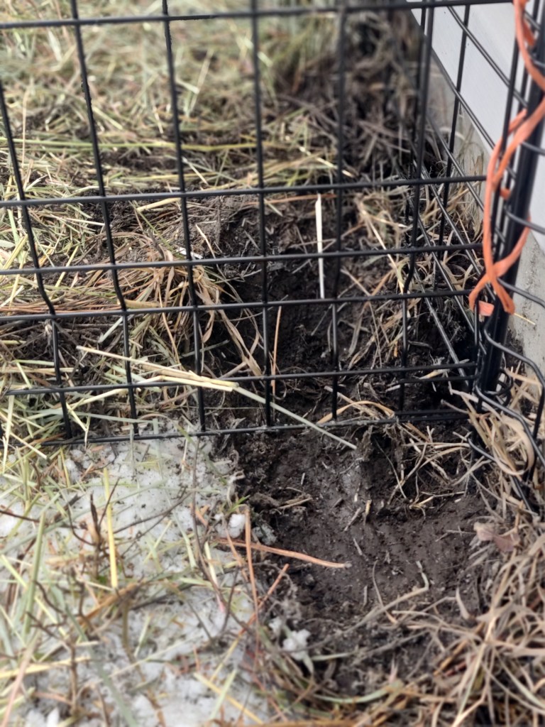 Turns out, Squeaky was a digger. He found the only thawed dirt close to the house and dug under the fence panels like a gopher. He was not staying in that repulsive cage. I was amazed and considered renaming him Sneaky.