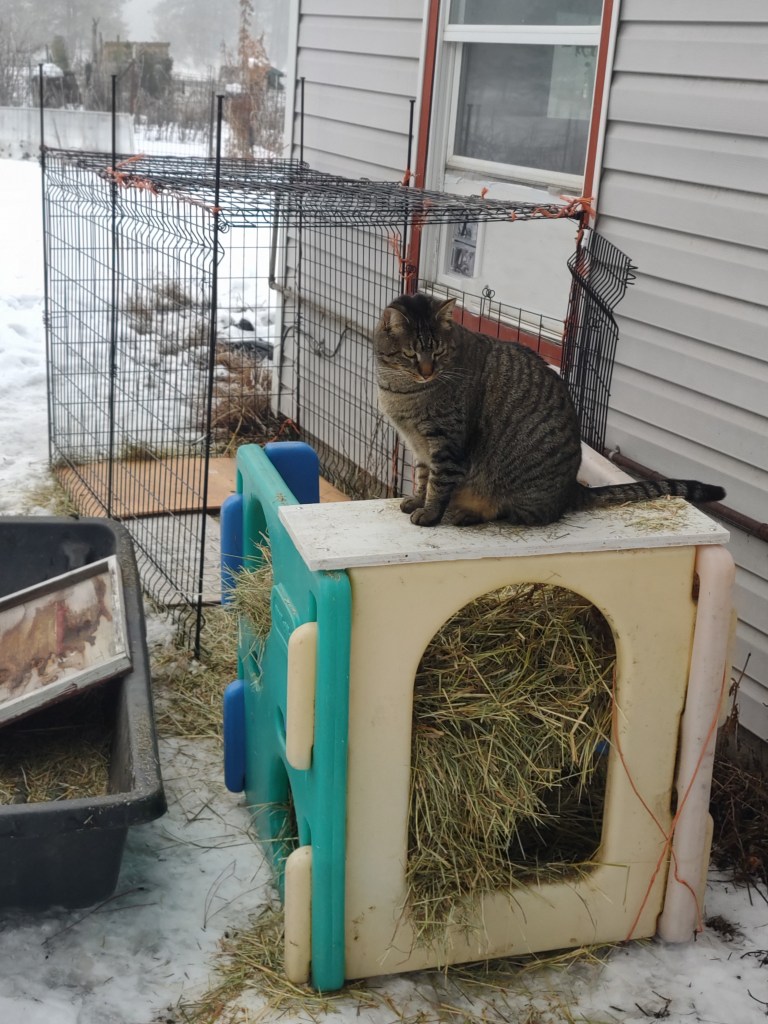 Several times during the evening I opened the cat door and tried to coax Squeaky back in; no response. Purrcy also went in and out several times, seemingly checking on his buddy. Squeaky just hunkered outside, insulted, refusing to move. I wasn’t worried, there was warm hay in the catio and I knew he could survive the night, being a barn cat and all. Finally, before bed, I grabbed a flashlight and went out to visually check on Squeaky. I stepped out the back door onto our screen porch, and there was Squeaky, happy in his usual basket. How did he escape? He surely couldn’t fit between the fence panels. And cats don’t dig.