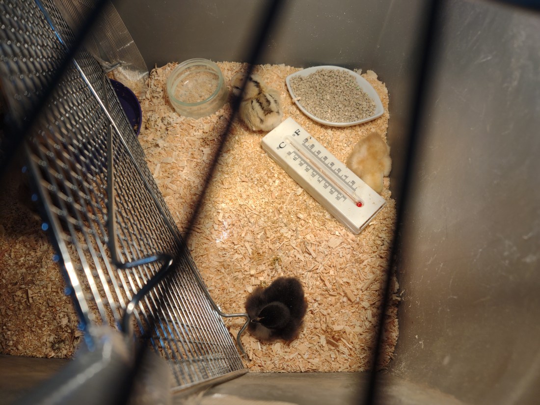 I’m looking forward to getting the chickies off the porch. They stink after a while. I have prepared the outdoor hutch, hung up a lamp, and added a run with a tarped roof. In this era of bird flu, it is recommended to keep wild birds and wild bird poop away from the domestic chickens. It will be a couple more weeks, though, before I can fully wean the little banties off the heat lamp. Then again, they are resourceful enough that they might just hunker underneath the Specks for warmth.